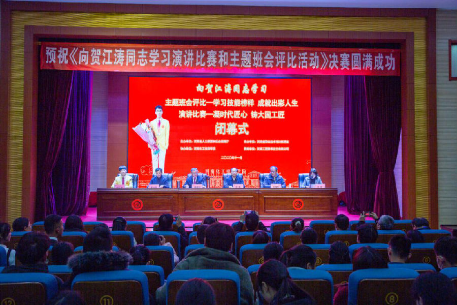河南省人力资源和社会保障厅副厅长李甄对广大师生寄予厚望,希望广大师生以贺江涛为榜样,勤学苦练,奋力拼搏,为技能河南、出彩中原贡献力量。最后李甄副厅长宣布本次“向贺江涛同志学习演讲比赛和主题班会评比活动”圆满闭幕。