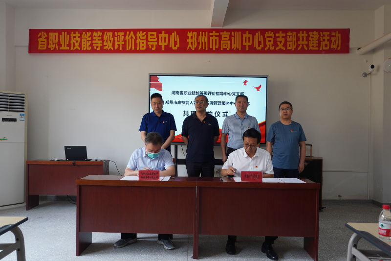 随后省评价中心全体党员一起重温了入党誓词,并举行了省评价中心与郑州市高技能人才公共实训管理服务中心党支部共建的签约仪式。郑州市人社局一级调研员丁进芳出席并讲话,郑州市人社局职业能力建设处、郑州市高技能人才公共实训管理服务中心、郑州市职业技能鉴定中心有关领导和党员也参加了相关活动。