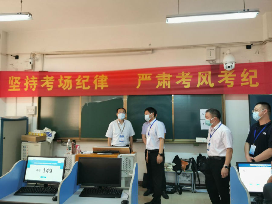 李甄副厅长一行在听取学院考试组织准备工作情况介绍后,走进考场、监控室、考务办等地进行实地考察,深入了解考场设置、疫情防控组织、监考老师安排、考生考试进展等情况。